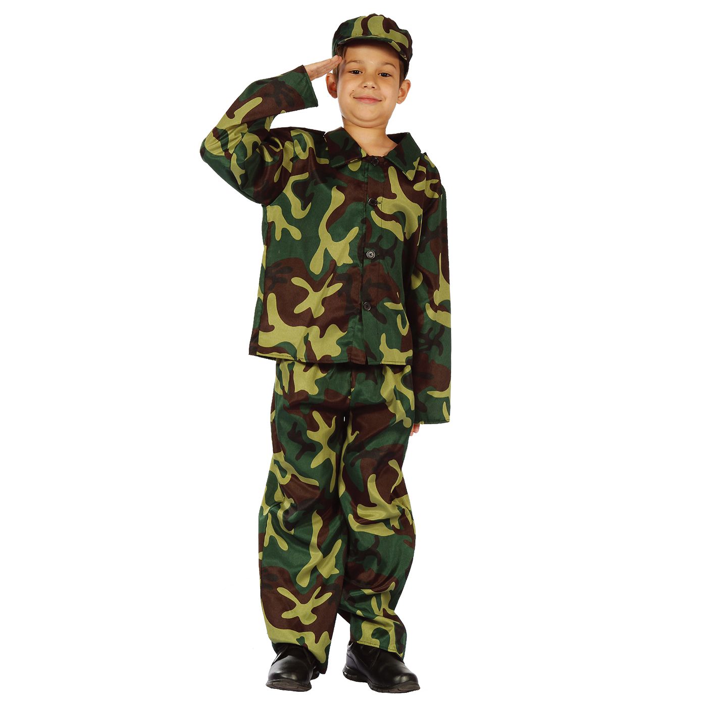 Children’s soldier costume set of 3 pieces (pants, shirt, hat) ideal for carnival and role-playing. Comfortable and easy to wear for parties and theatrical performances.