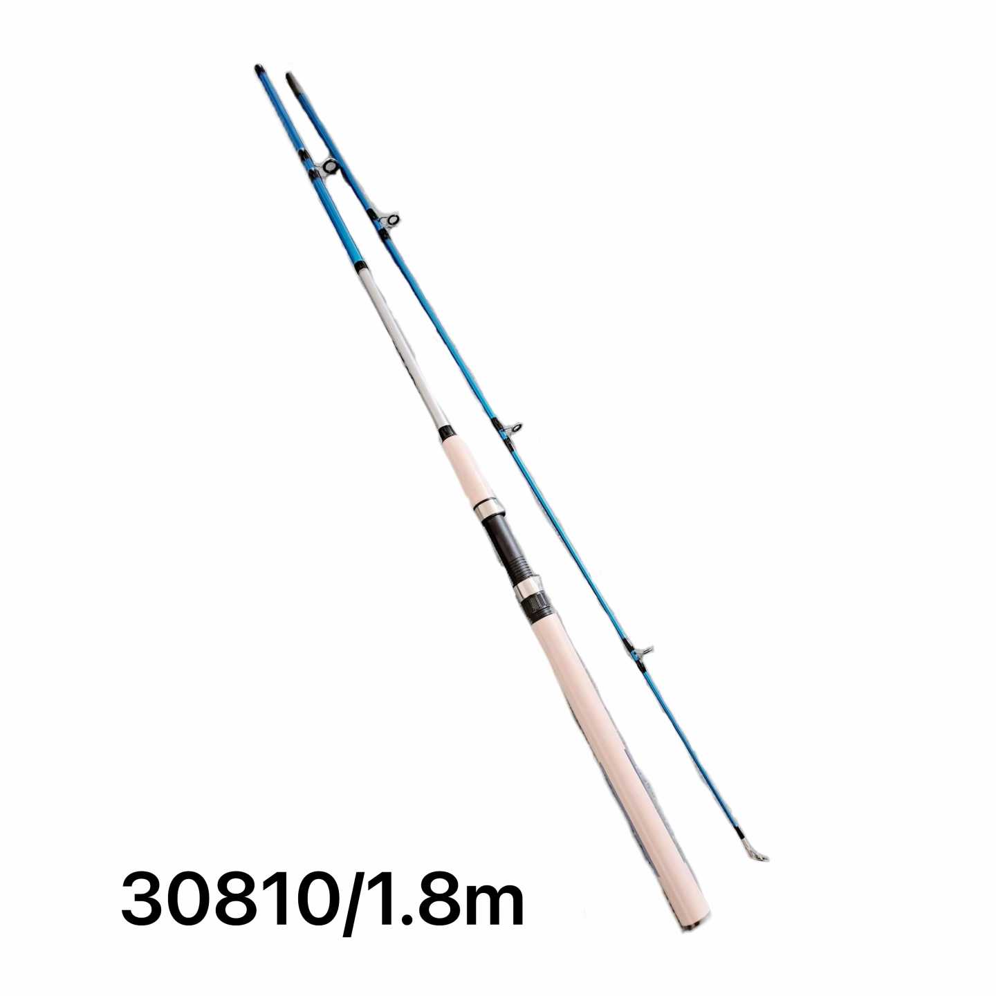 Two-piece fishing rod, made of reinforced fibers, equipped with guides and a high-quality ergonomic handle.