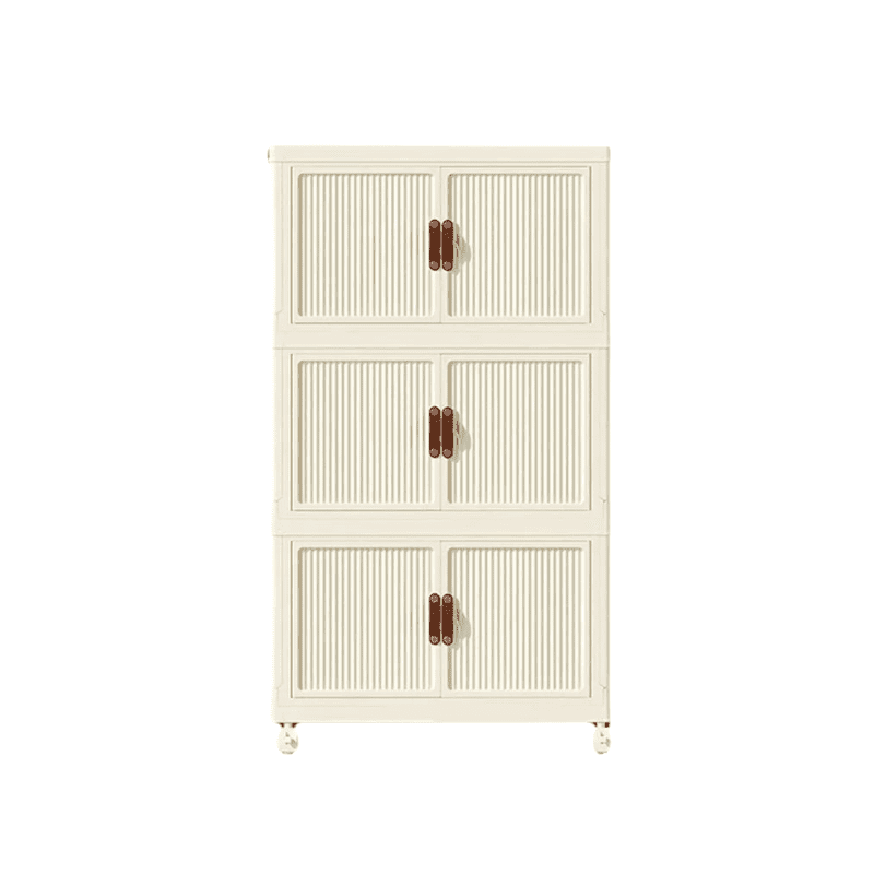 Folding plastic storage wardrobe with 3 levels, wheels, and removable shelves for easy movement and storage. Dimensions: 69x48x24 cm.