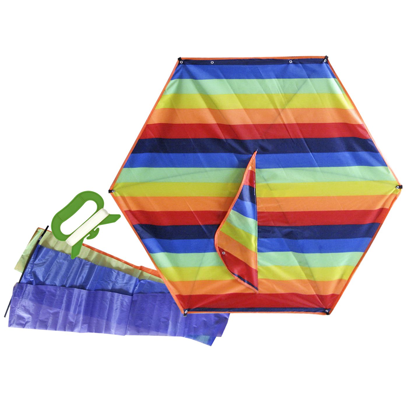 Hexagonal eagle 1x1m made of durable polyester, with tail and string. Lightweight and ready to fly, ideal for playing in outdoor spaces and festivals.