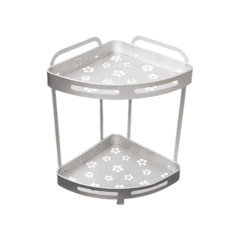 Two-tier corner bathroom shelf with metal frame and practical design that can be wall-mounted or placed on a surface.