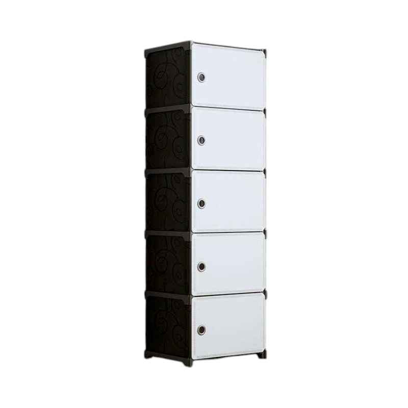 Plastic 5-tier floor storage cabinet, with a sturdy frame and compartments with doors made of thin, flexible, highly durable plastic material,