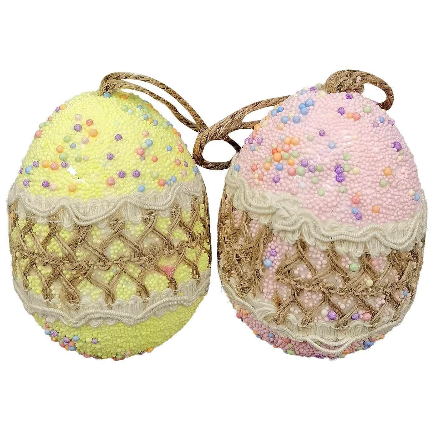 Set of 2 decorative eggs with handle, dimensions 9×7 cm each, ideal for Easter or seasonal decoration.