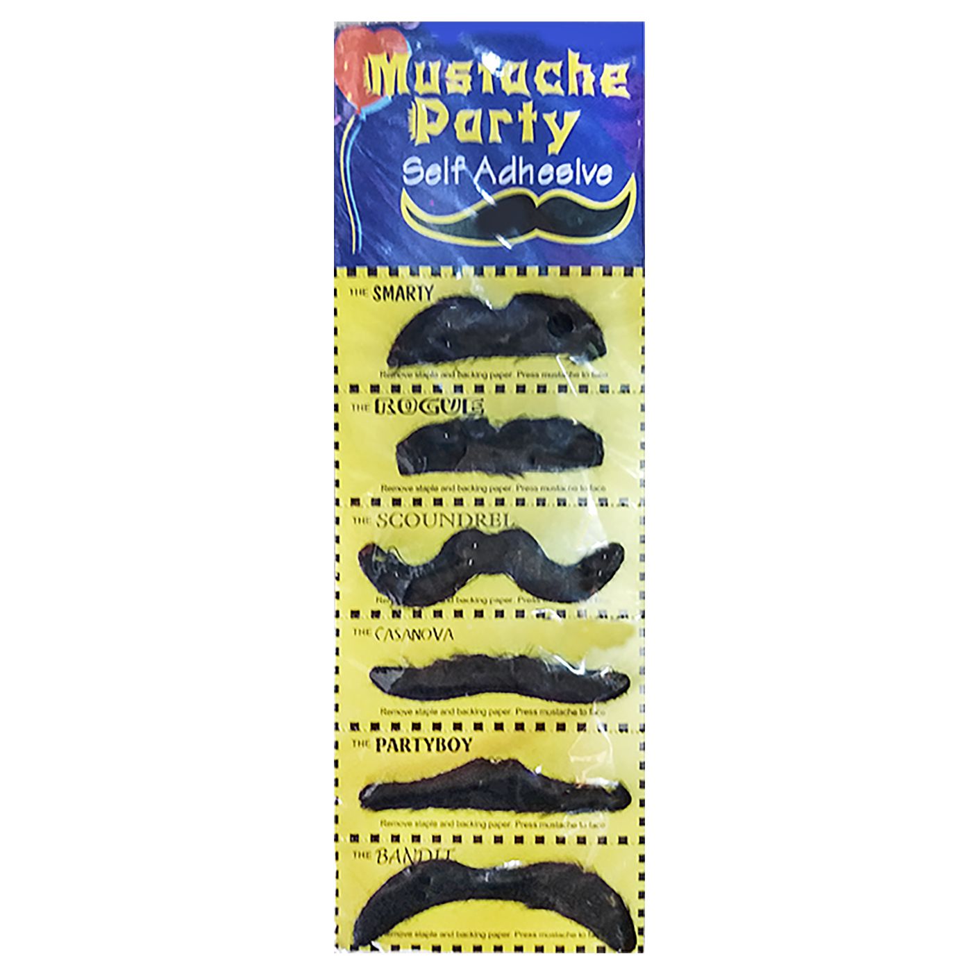 Set of 6 small mustaches on a 27x11cm card — ideal for carnival, photo booth, and theatrical plays. Stickers, easy to use for a quick and fun result.