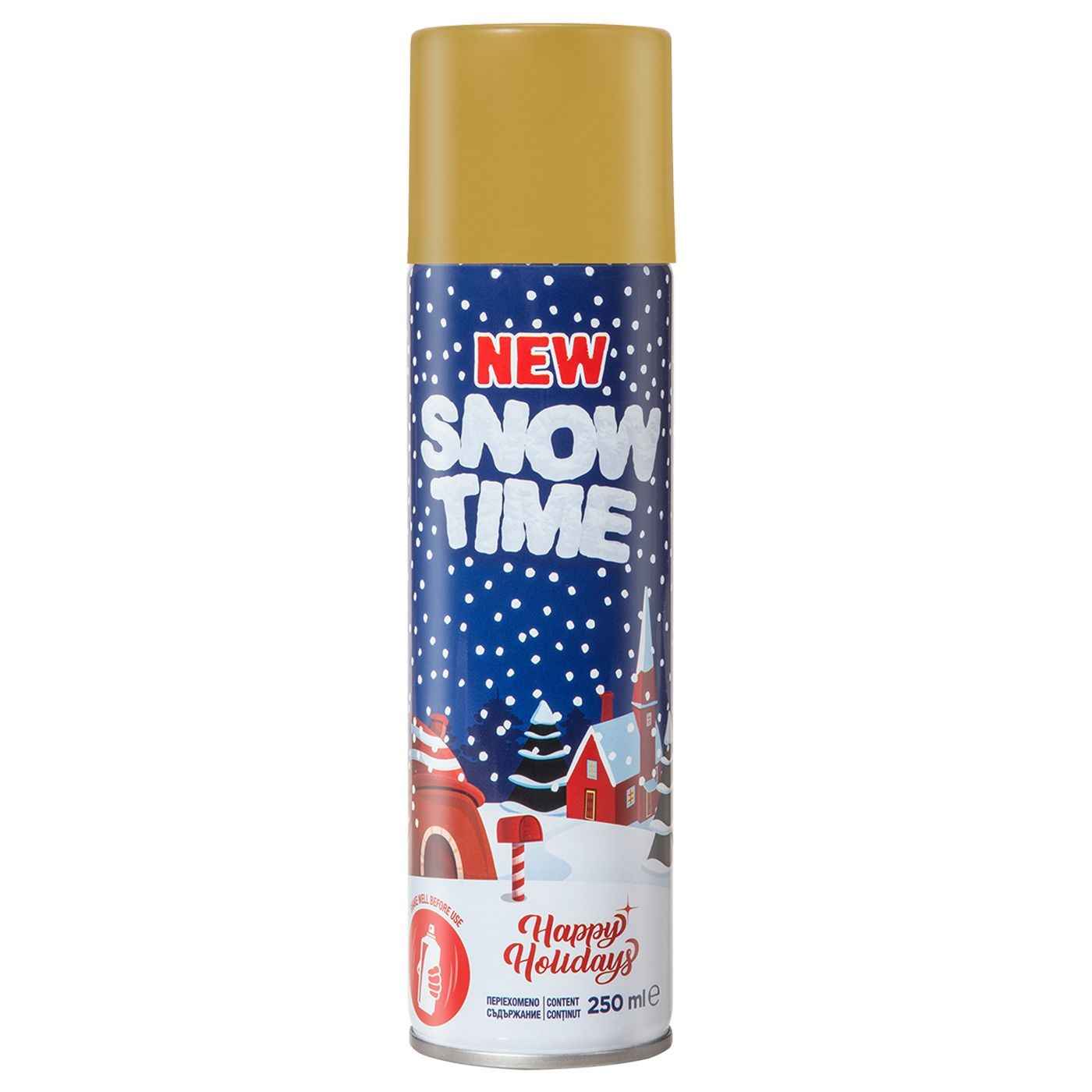 It is a gold-colored snow spray in a 250ml package for decorative use with a metallic shine.