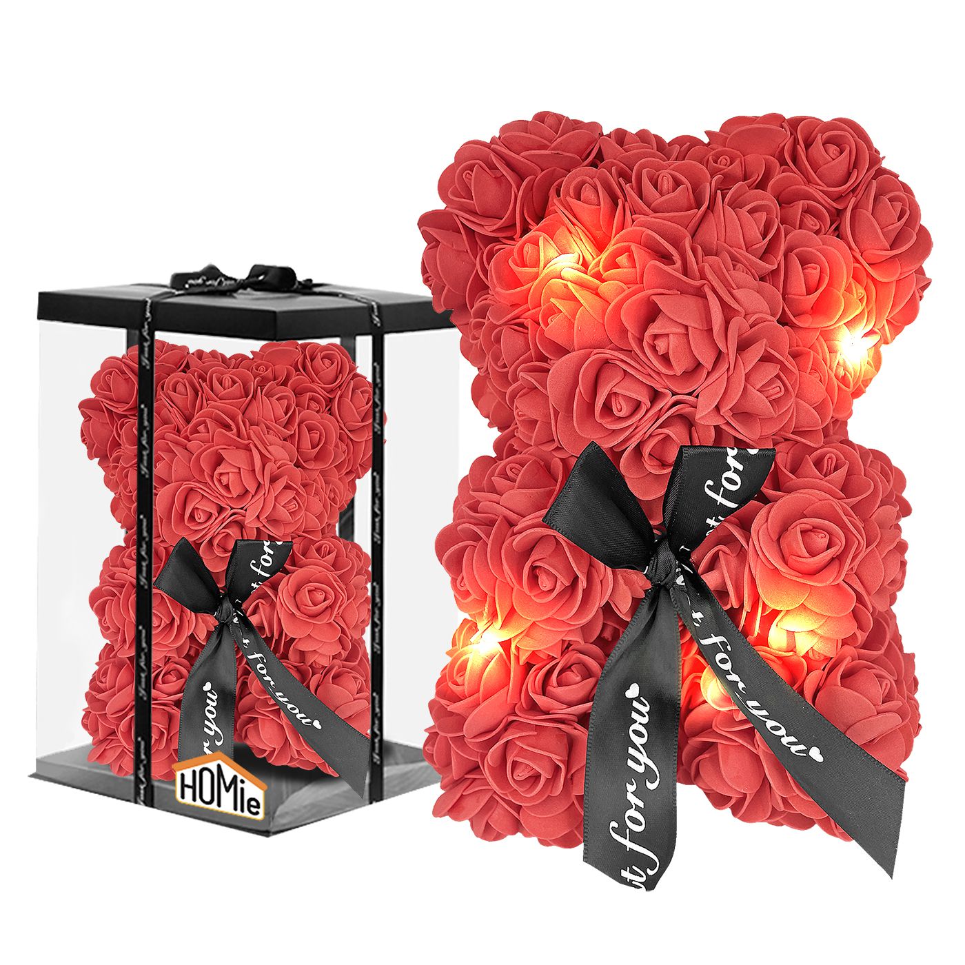 Teddy bear made of artificial roses with 20 yellow LED lights and 3 programs. Height 23cm, comes with a 25cm box (box assembly required) and batteries included.