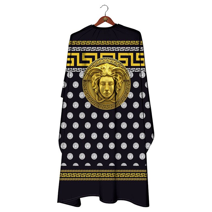 Professional cutting cape for barbershops with an attractive design, made of polyester material with a perfect fit for every type of customer thanks to the elastic collar with metal hook closure.