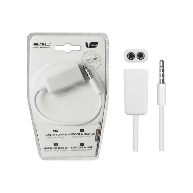Adattatore jack 3,5 mm maschio a 2 femmine, lunghezza 15 cm di colore bianco. Ideale per collegare due cuffie o dispositivi audio contemporaneamente con riproduzione stereo.