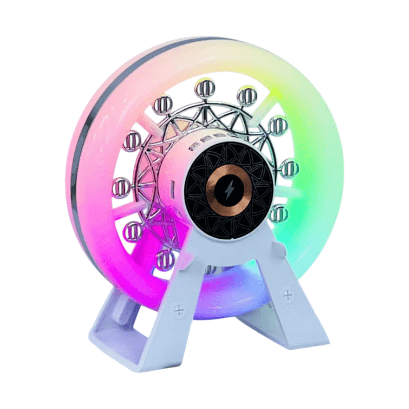 Altoparlante Bluetooth wireless con design impressionante a ruota di luna park, con illuminazione LED e design moderno che può funzionare anche come decorazione per l’ambiente, mentre con la sua illuminazione multicolore crea un’atmosfera magica.