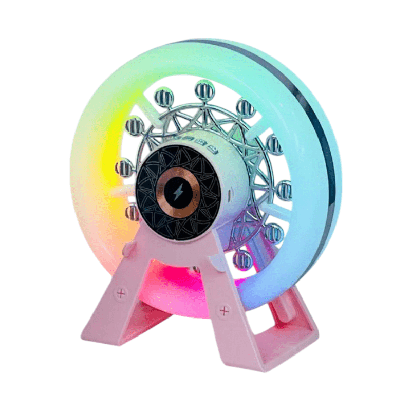 Altoparlante Bluetooth wireless con design impressionante a ruota di luna park, con illuminazione LED e design moderno che può funzionare anche come decorazione per l’ambiente, mentre con la sua illuminazione multicolore crea un’atmosfera magica.