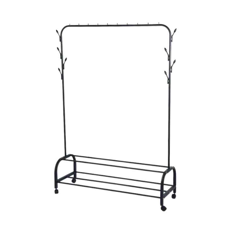 Appendiabiti da pavimento su ruote in metallo, con 2 ripiani per scarpe e appendini laterali, ideale come mobile d’ingresso o per organizzare i vestiti nella tua stanza.