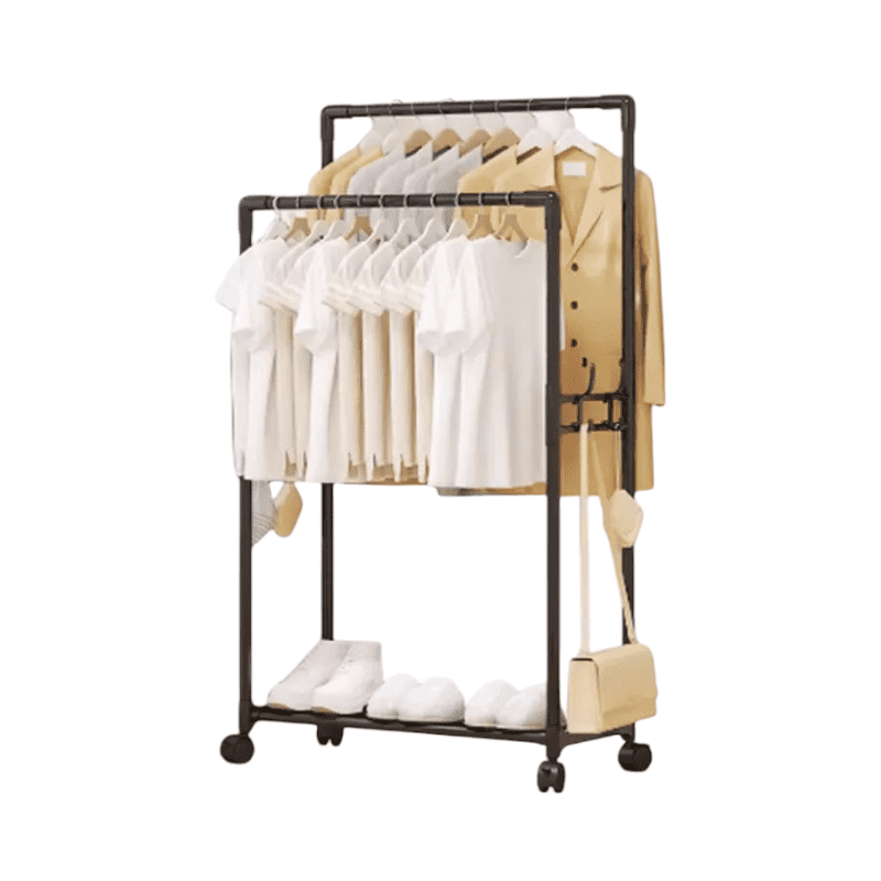 Appendiabiti da pavimento su ruote in metallo, con ripiano porta scarpe e appendini laterali, ideale come mobile d’ingresso o per organizzare i vestiti nella tua stanza.