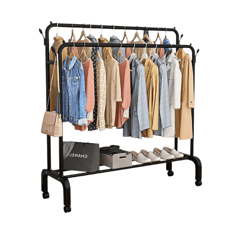 Appendiabiti da pavimento doppio su ruote, in metallo, con ripiano porta scarpe e appendini laterali, ideale come mobile d’ingresso o per organizzare i vestiti nella tua stanza.