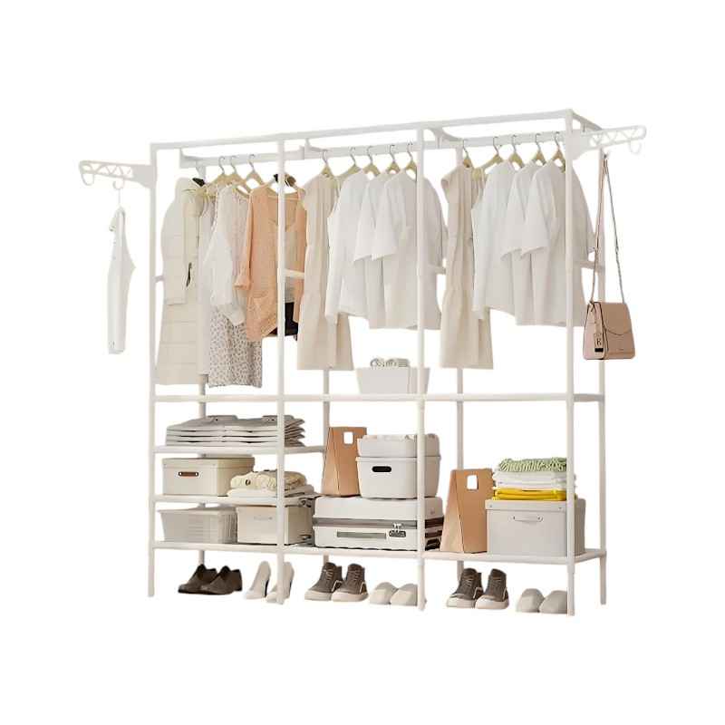 Appendiabiti da terra con struttura metallica, con ripiani in tessuto per scarpe e accessori e gancio appendiabiti pieghevole extra sui lati,