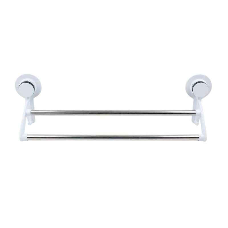 Porta asciugamani doppio da 59 cm con barra metallica in inox e basi in plastica resistenti. Si installa rapidamente con potenti ventose senza viti, ideale per un facile organizzazione del bagno.