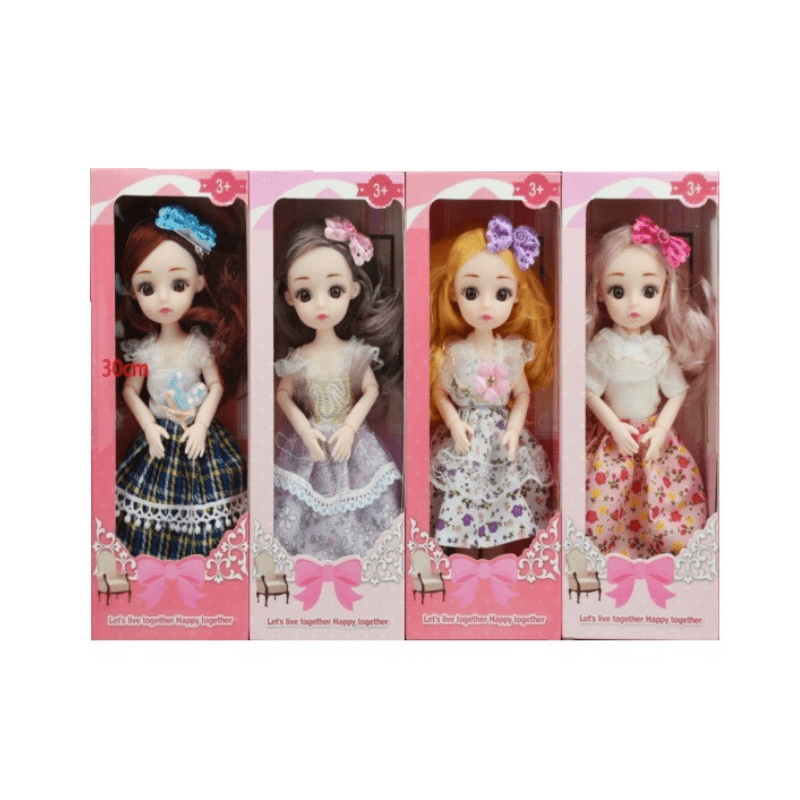 Set di 4 bambole vintage con accessori, ideali per giocare e collezionare. Dimensioni della confezione 12x30x8cm. Adatte per bambini dai 3 anni in su e conformi agli standard di sicurezza.