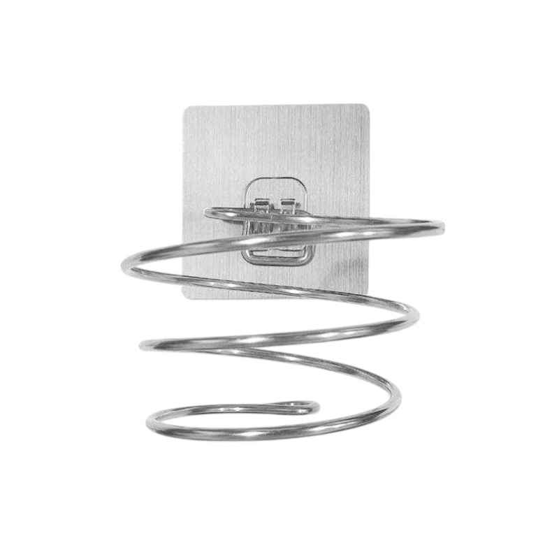 Supporto metallico da parete per phon con forte adesivo, senza viti. Facile da installare, resistente e salva spazio nel bagno.