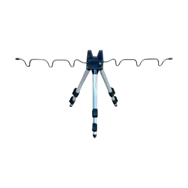 Base di supporto per canne da pesca pieghevole con treppiede. Struttura robusta in alluminio. Lunghezza base per canne: 60m.