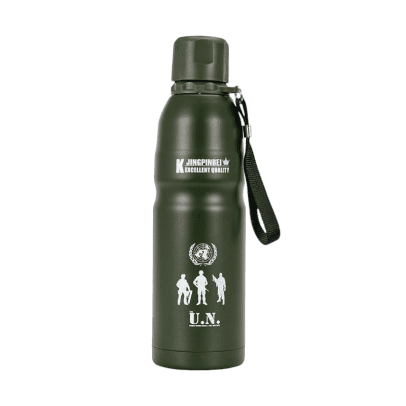Borraccia termica portatile con interno in acciaio inossidabile 100%, pareti doppie e rivestimento ad alta resistenza che mantiene la temperatura del contenuto stabile per ore.