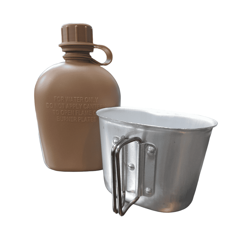 Set borraccia militare con borraccia da 750ml in plastica rigida. Dispone di tappo a vite di sicurezza e manico pieghevole, ideale per campeggio e escursionismo.