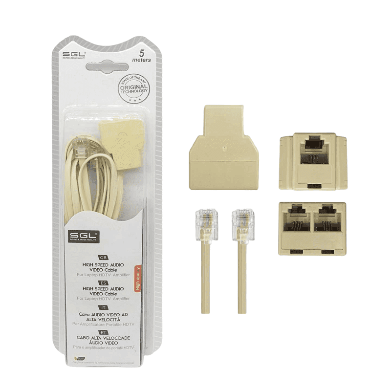 Cavo a linea telefonica piatto, 6P4C1-2 con derivatore a 2 uscite. Lunghezza: 5m.