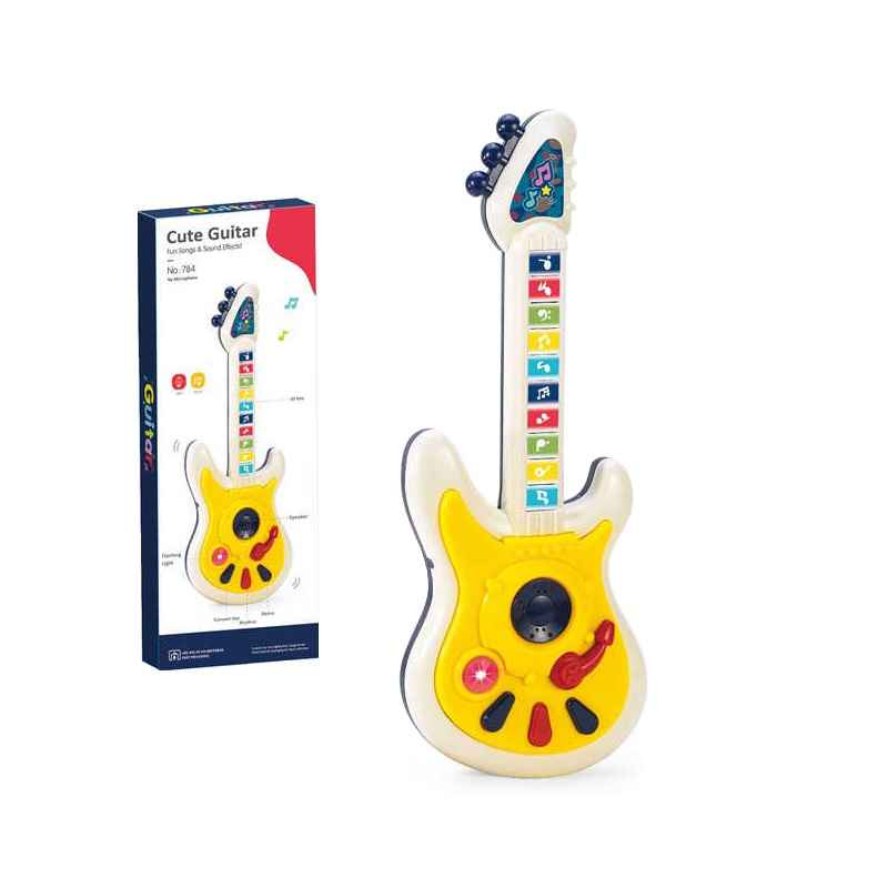 Chitarra elettronica per bambini con molti suoni musicali diversi e illuminazione, in un meraviglioso design multicolore.
