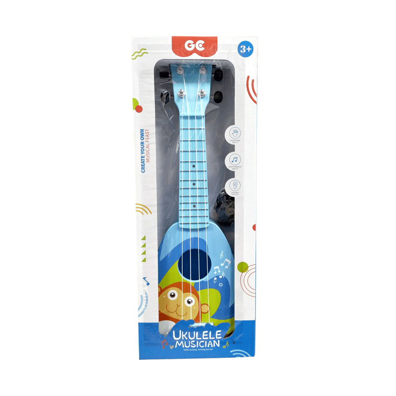 Chitarra per bambini con design colorato, adatta per bambini dai 3 anni in su. Conforme agli standard di sicurezza e con dimensioni compatte 46x18x6,5 cm — ideale per le prime esperienze musicali e come regalo.