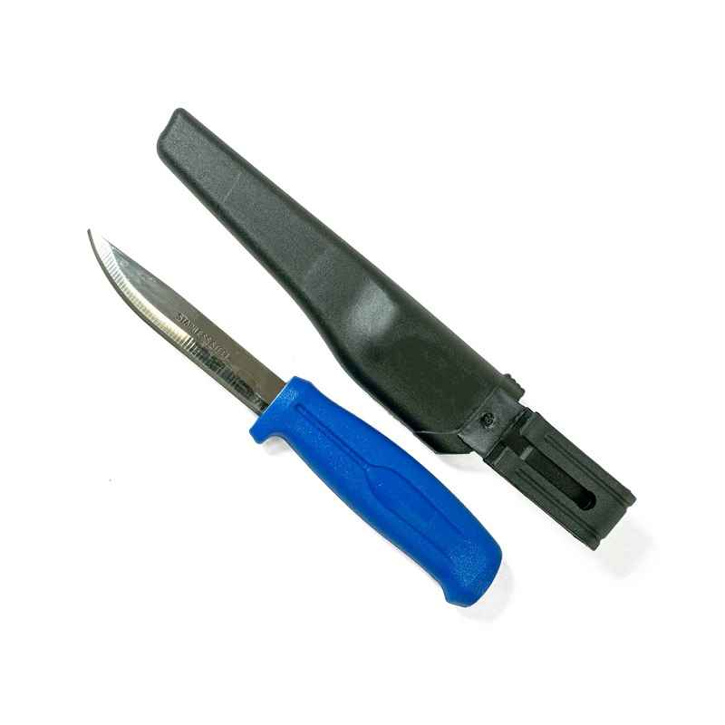 Coltello tascabile da pesca con lama in acciaio resistente e manico ergonomico. Dispone di una custodia speciale con clip per un trasporto sicuro e comodo.