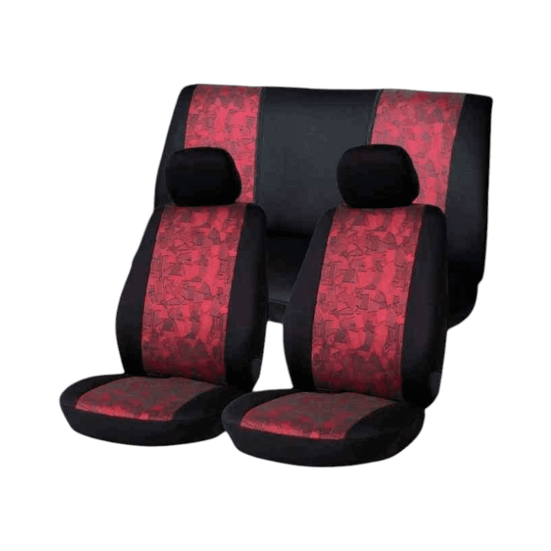 Coperture universali per sedili auto di colore rosso. Realizzate in tessuto resistente con un sottile strato interno di spugna e design ergonomico, includono coperture per i sedili anteriori, posteriori e i poggiatesta.