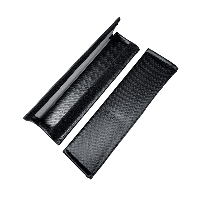 Cuscinetti protettivi per cintura di sicurezza dell’auto in colore nero carbonio, realizzati in materiale rinforzato e resistente, completamente compatibile con la pelle, che protegge la cintura dall’usura e offre una vestibilità comoda senza fastidi.