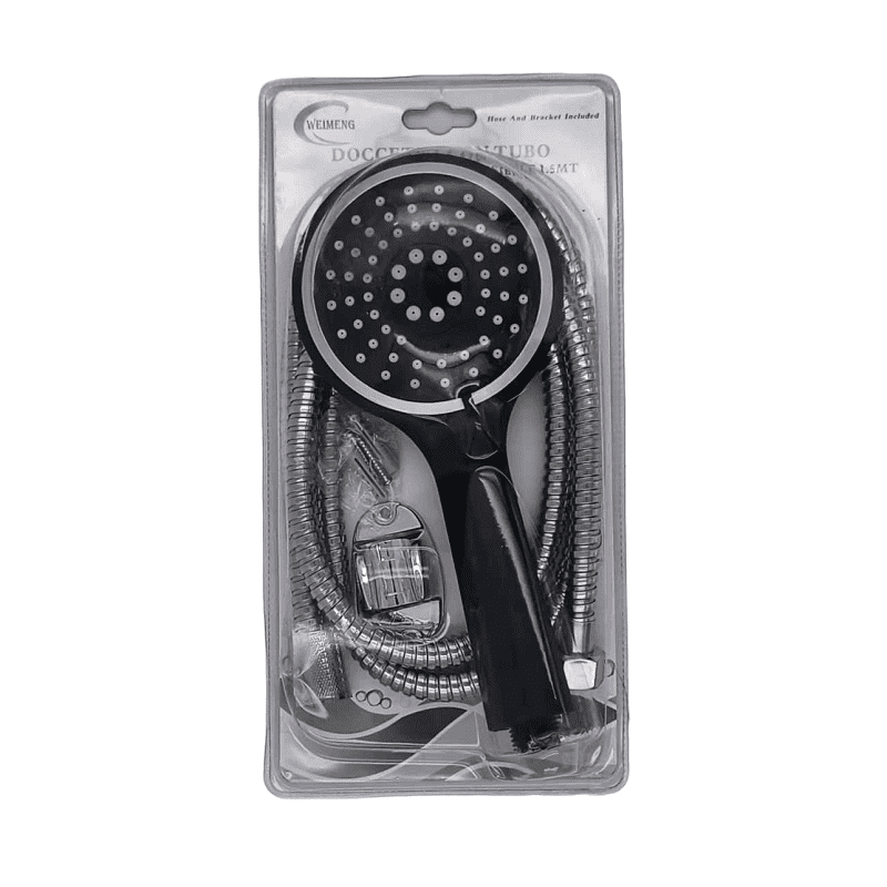Telefono doccia con tubo flessibile da 1,5 m e 3 opzioni di pressione, protezioni in silicone contro il calcare e facile installazione su vasche/docce. Finitura nera resistente.