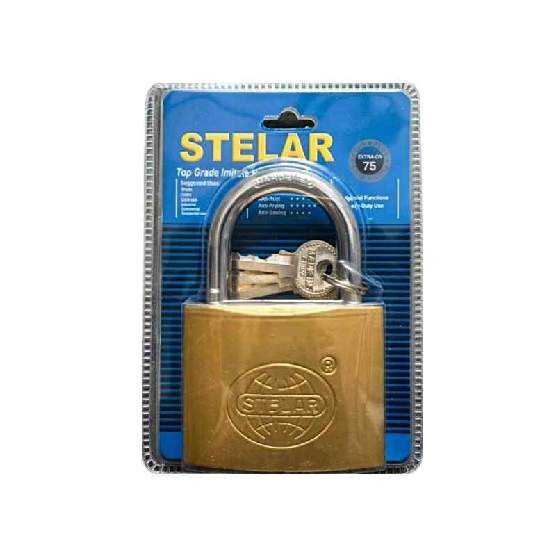 Lucchetto a collo corto 75mm con corpo in ottone e collo in acciaio. Include un set di chiavi per la chiusura sicura di porte e sportelli.