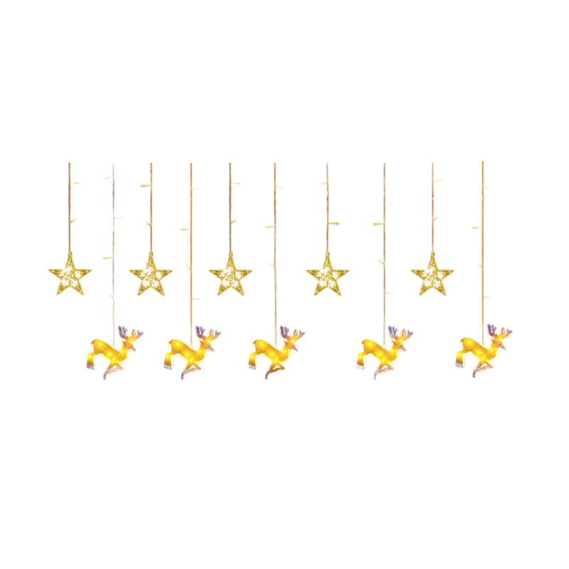 Luci decorative LED natalizie a tenda con motivo renne e stelle.