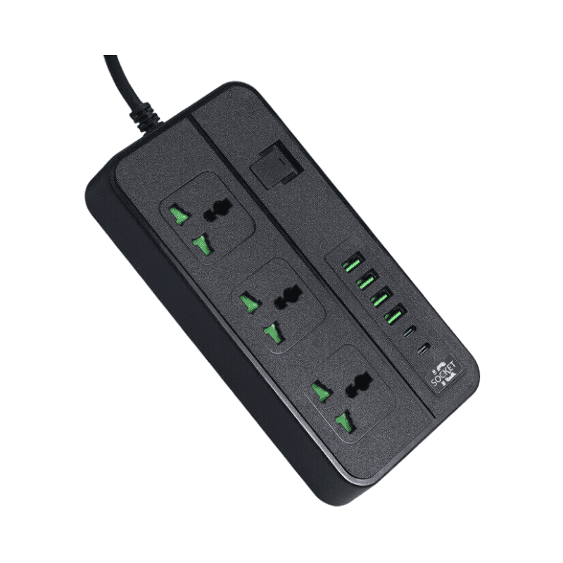 Multipresa a 3 posti con interruttore e porte di ricarica integrate — 4×USB e 2×Type‑C, potenza massima 3000W per l’alimentazione simultanea dei dispositivi.