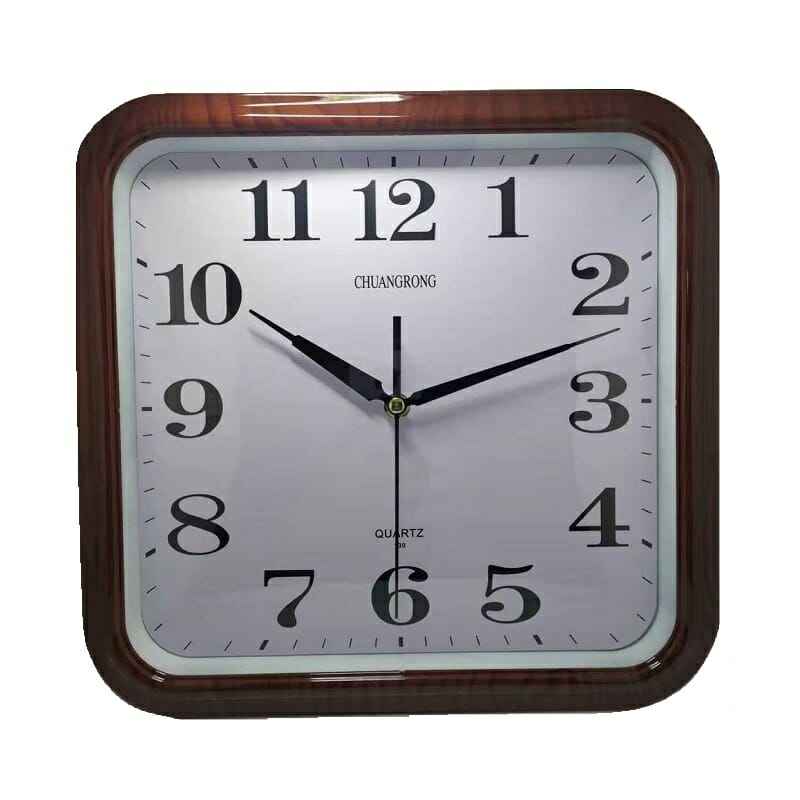 Orologio da parete classico in design vintage con effetto legno sulla cornice. Dimensioni 30×30 cm e realizzato in plastica — ideale per soggiorno, cucina o ufficio.