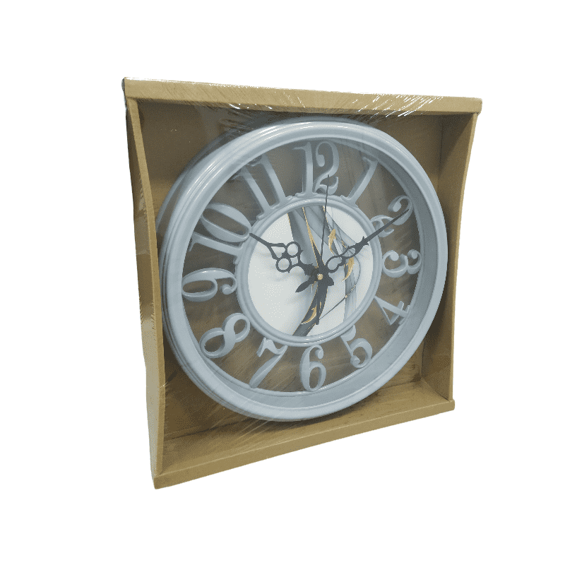 Orologio da parete in elegante grigio con cifre in rilievo. Diametro 30cm, cornice in plastica — ideale per soggiorno, cucina o ufficio.