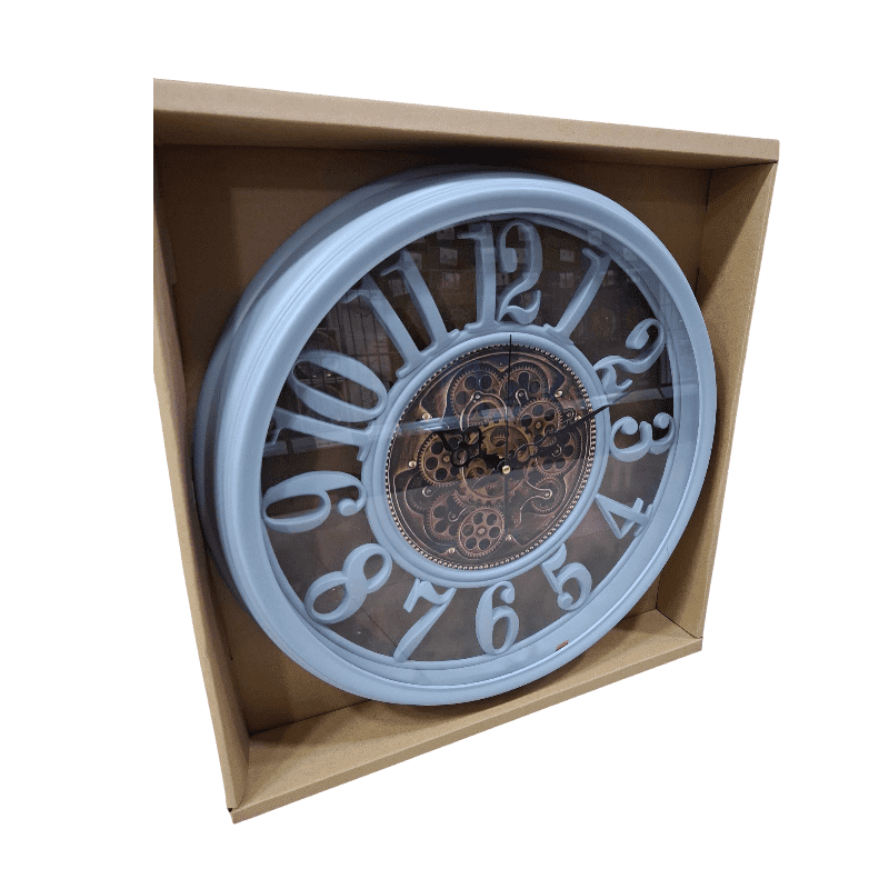 Orologio da parete 35cm in plastica grigia con cifre in rilievo — elegante e facile da appendere, ideale per soggiorno e ufficio.