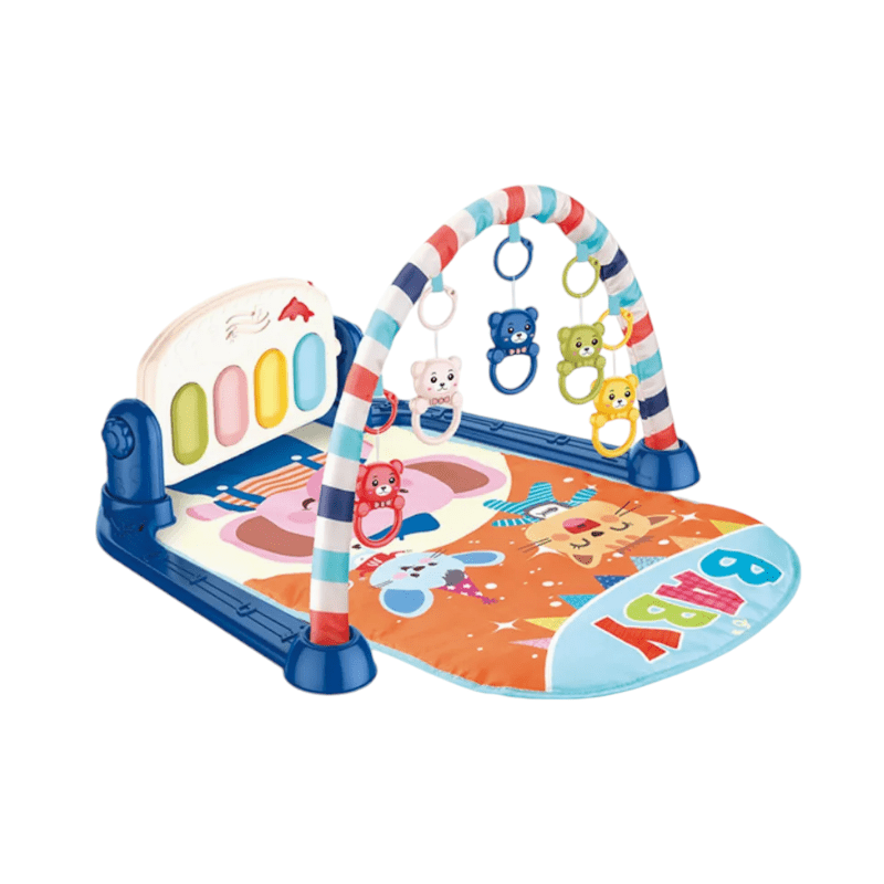Ginnastica per neonati con giochi sospesi e tasti per i piedi, con suoni e molteplici funzionalità.