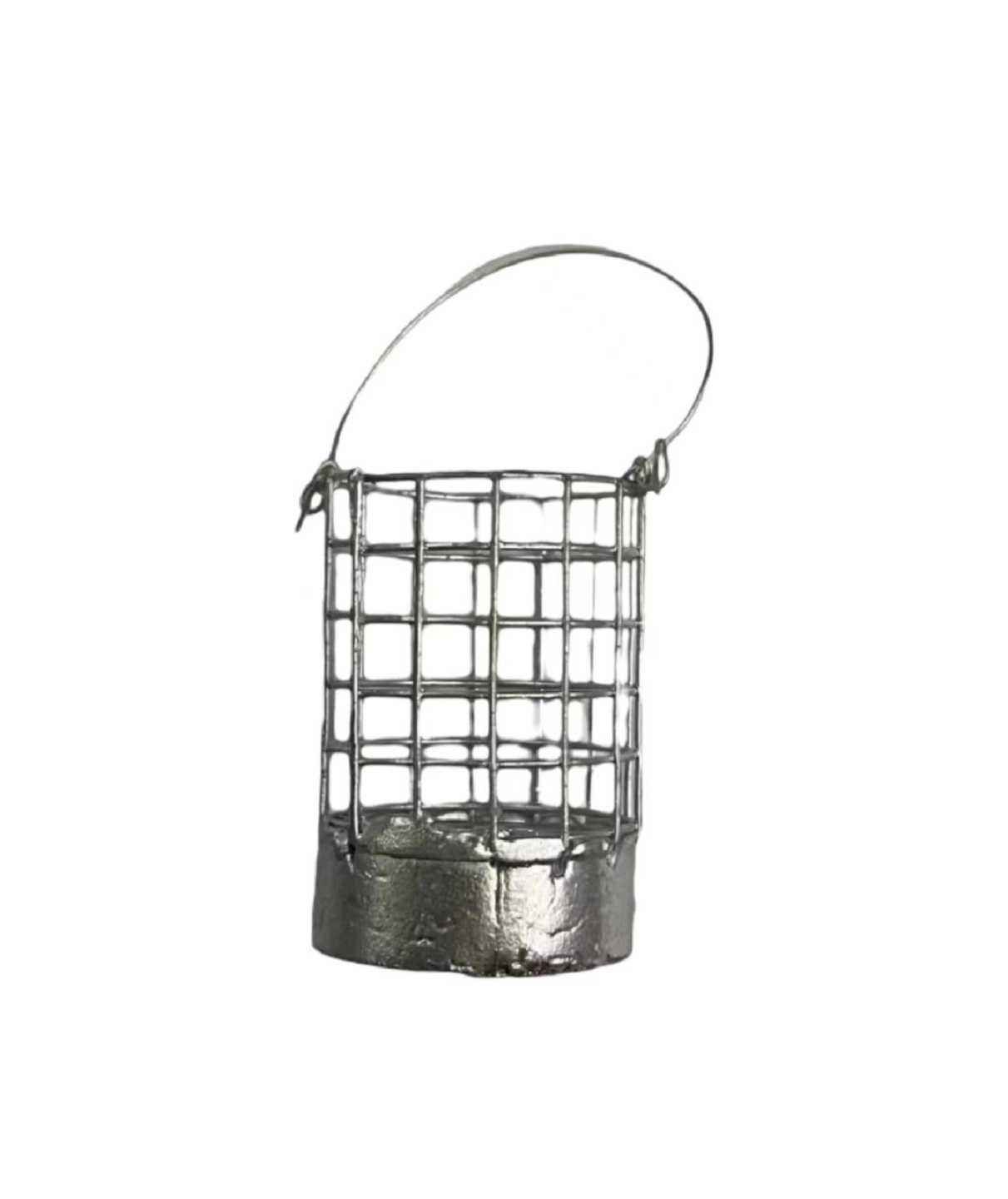 Pasturatore da pesca in filo metallico con piombo integrato da 70g e lunghezza ~6cm. Design aperto per un facile riempimento e una distribuzione uniforme dell’esca, ideale per la pesca con pasturazione.