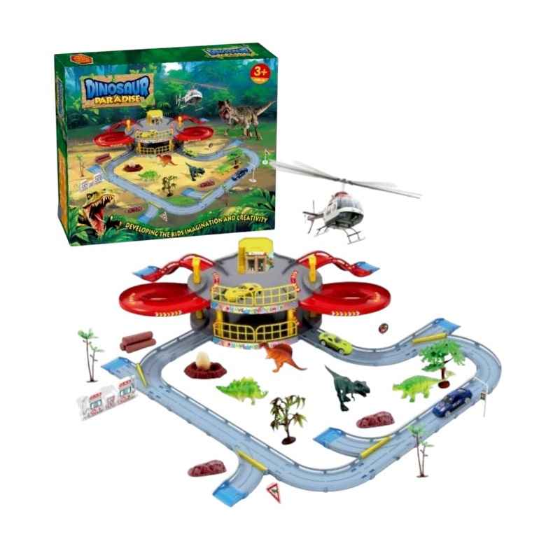 Pista per automobili con parcheggio e tema dinosauri, facile da montare e sicura per bambini dai 3 anni in su. Ideale per un gioco creativo e divertente.
