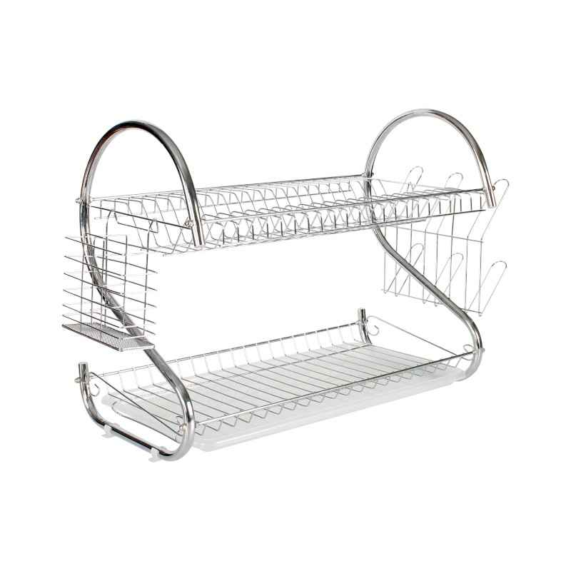 Scolapiatti a due piani in inox, con design pratico, dotato di portaposate e supporti per bicchieri.