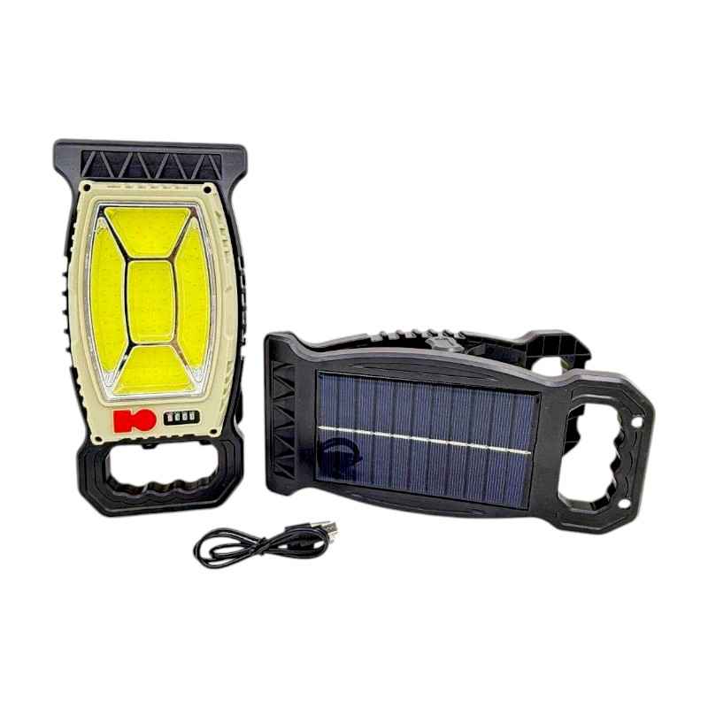 Proiettore LED ricaricabile con pannello solare che offre una maggiore autonomia della batteria e una pratica clip di fissaggio per un facile posizionamento ovunque.