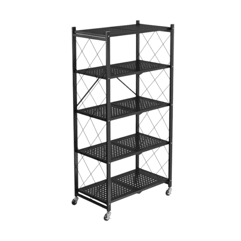 Scaffale metallico a 5 livelli con ruote e design pieghevole per una facile conservazione. Dimensioni: 163 x 71 x 35 cm — ideale per l’organizzazione della casa, del garage o del magazzino.