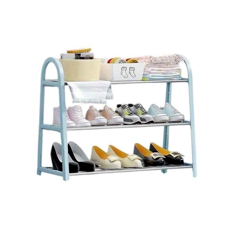Scaffale per scarpe a 3 livelli, con barre metalliche e facile da montare. Dispone di piedini antiscivolo per proteggere il pavimento.