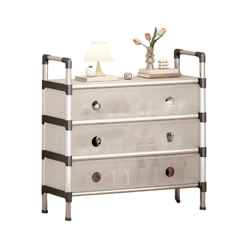 Scarpiera da pavimento con ripiano, con struttura metallica e 3 cassetti con frontale sottile, in plastica flessibile,