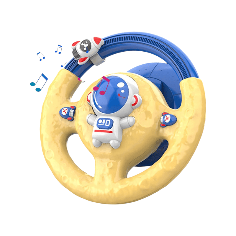 Volante elettronico per bambini con design impressionante a forma di luna con astronauta, con suoni, musica e illuminazione. Ruota a 360° per un’esperienza di guida realistica. Si fissa con ventose su qualsiasi superficie liscia.