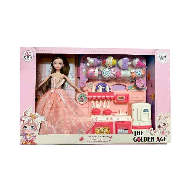 Set di bambola vintage con set completo di accessori da cucina per un gioco di ruolo creativo. Adatto a bambini di età superiore ai 3 anni, sicuro e colorato — ideale come regalo.