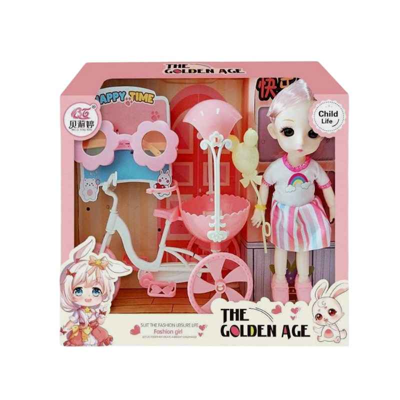 Set bambola con bicicletta e set completo di accessori per gite infinite e gioco creativo. Adatto a bambini di 3 anni e oltre, conforme agli standard di sicurezza.
