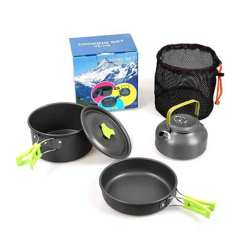 Set da cucina portatile 3 pezzi per campeggio e picnic, con superficie antiaderente resistente, design impilabile per un facile trasporto e pratica custodia per il trasporto.