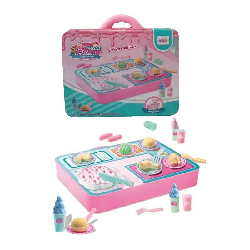 Include un set completo di pentole e play-food per una piccola cucina completa in una valigetta portatile.